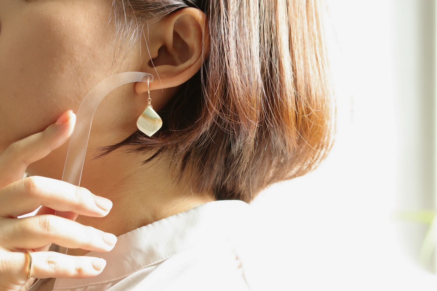 肌馴染みのよいナチュラルな色合いで、どんな装いにもすっと溶け込む、シンプルな仕立てのピアスです。