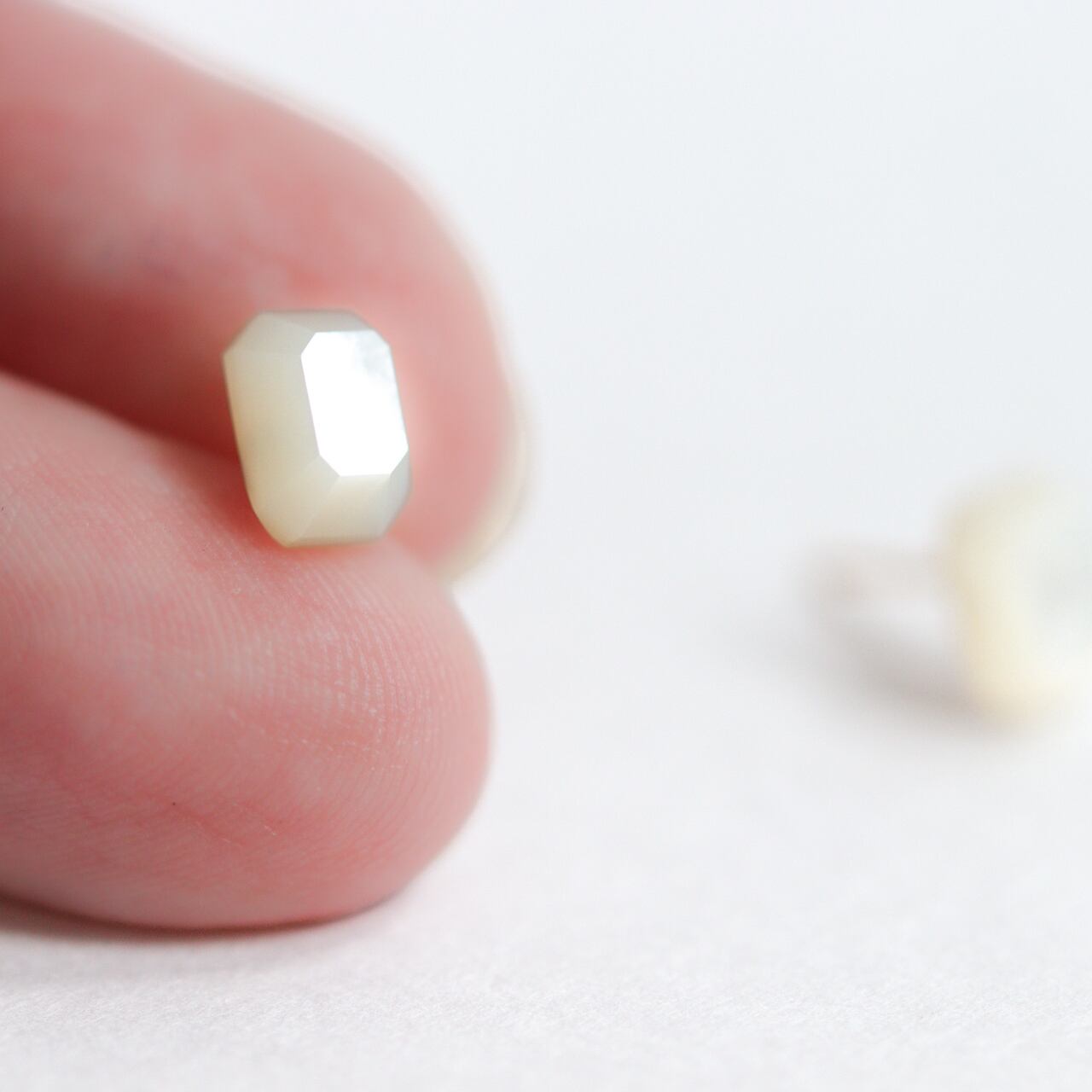 マザーオブパールといえばオーバル型が多い中で、あえて小さく、カットの入ったスクエア型を選びました。