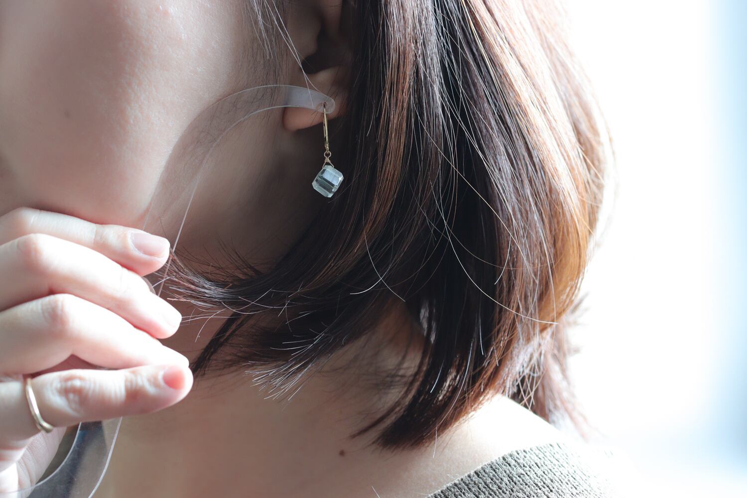 ころんとしたキューブ型のアメジストが耳元で静かに揺れ、