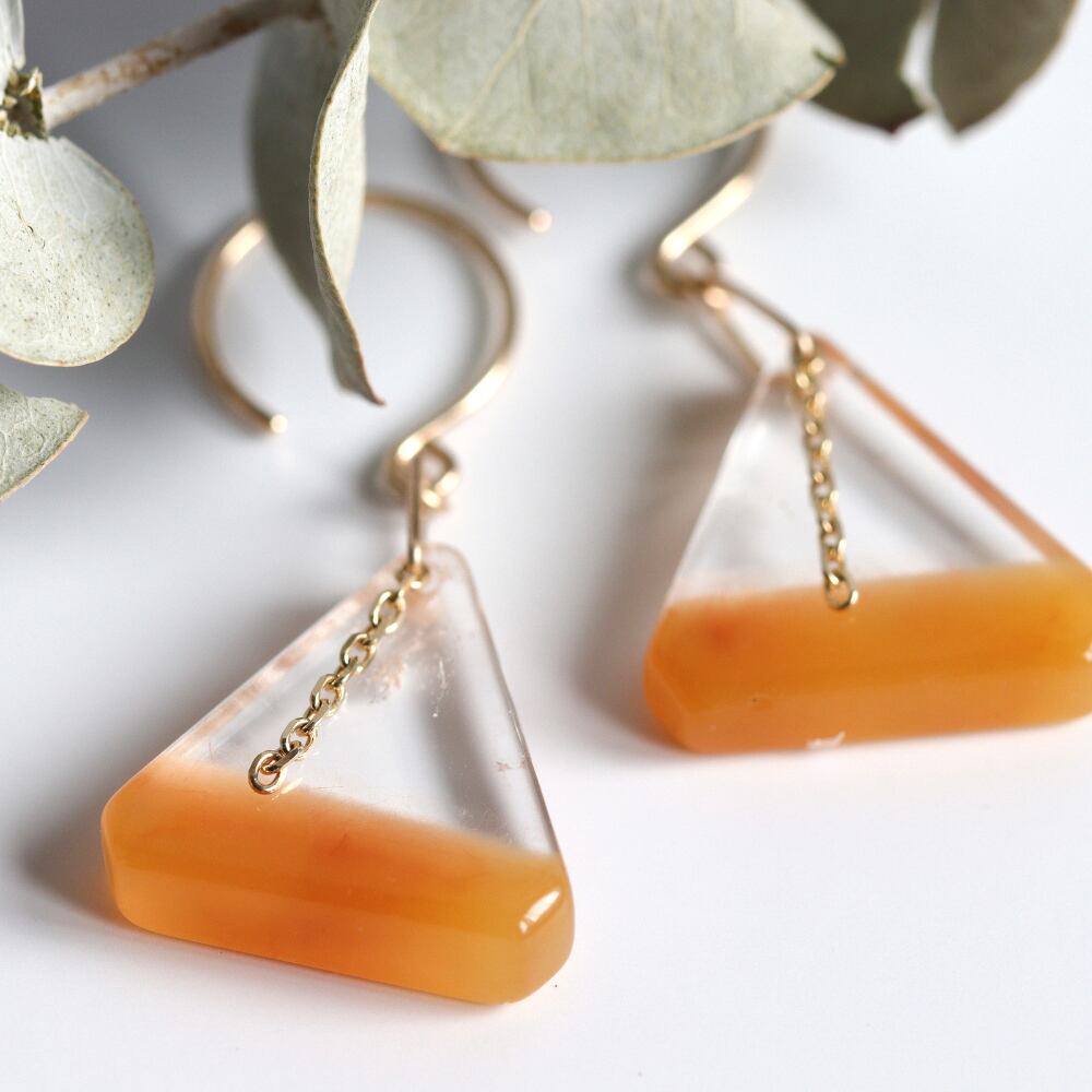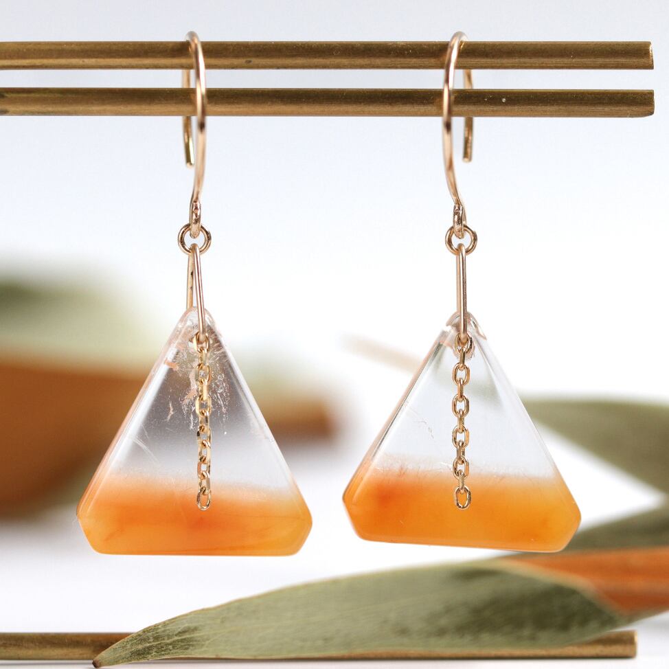 向こう側が透けて見えるほどのクリアな水晶に、南国の果実を思わせるカラーがふわりと浮かび、耳元に軽やかでみずみずしい彩りを添えます。